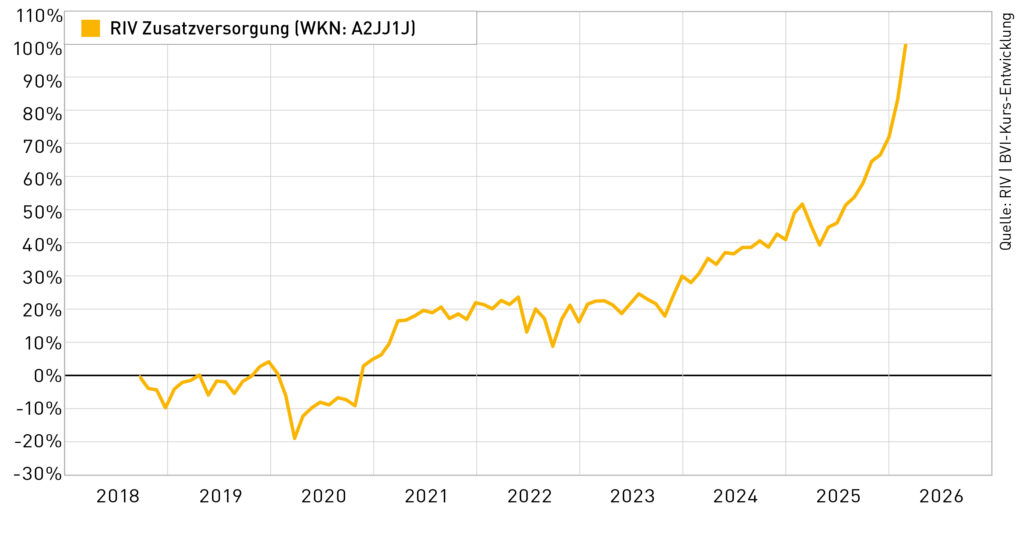 Hinweise: Dies ist eine Marketing-Anzeige. Die Wertentwicklung basiert auf Daten zum 28.02.2026 und wurde nach BVI-Methode berechnet. Die dargestellten Anlageergebnisse beinhalten sämtliche Fondskosten, nicht aber den Rücknahmeabschlag in Höhe von 0,5 %, der vollumfänglich im Fondsvermögen verbleibt und somit langfristigen Anlegern zugute kommt. Historische Wertentwicklungen lassen keine Rückschlüsse auf ähnliche Entwicklungen in der Zukunft zu. Der Fonds kann auch innerhalb kurzer Zeiträume erheblichen Schwankungen nach oben oder nach unten unterworfen sein. Sollten die im Fonds nach Deckung der Kosten erzielten Erträge nicht für die Ausschüttung ausreichen, kann der Fonds die Ausschüttungen aus dem verfügbaren Bankguthaben des Fonds entnehmen (Substanzausschüttung). Dies kann zur Minderung des Anteilswerts führen. Bitte lesen Sie den Verkaufsprospekt und die wesentlichen Anlegerinformationen, bevor Sie eine Anlageentscheidung treffen. Diese sind auf unserer Internetseite www.riv.de kostenfrei und in deutscher Sprache zu finden. Eine Zusammenfassung der Anlegerrechte in deutscher Sprache finden Sie unter www.riv.de/Anlegerrechte.