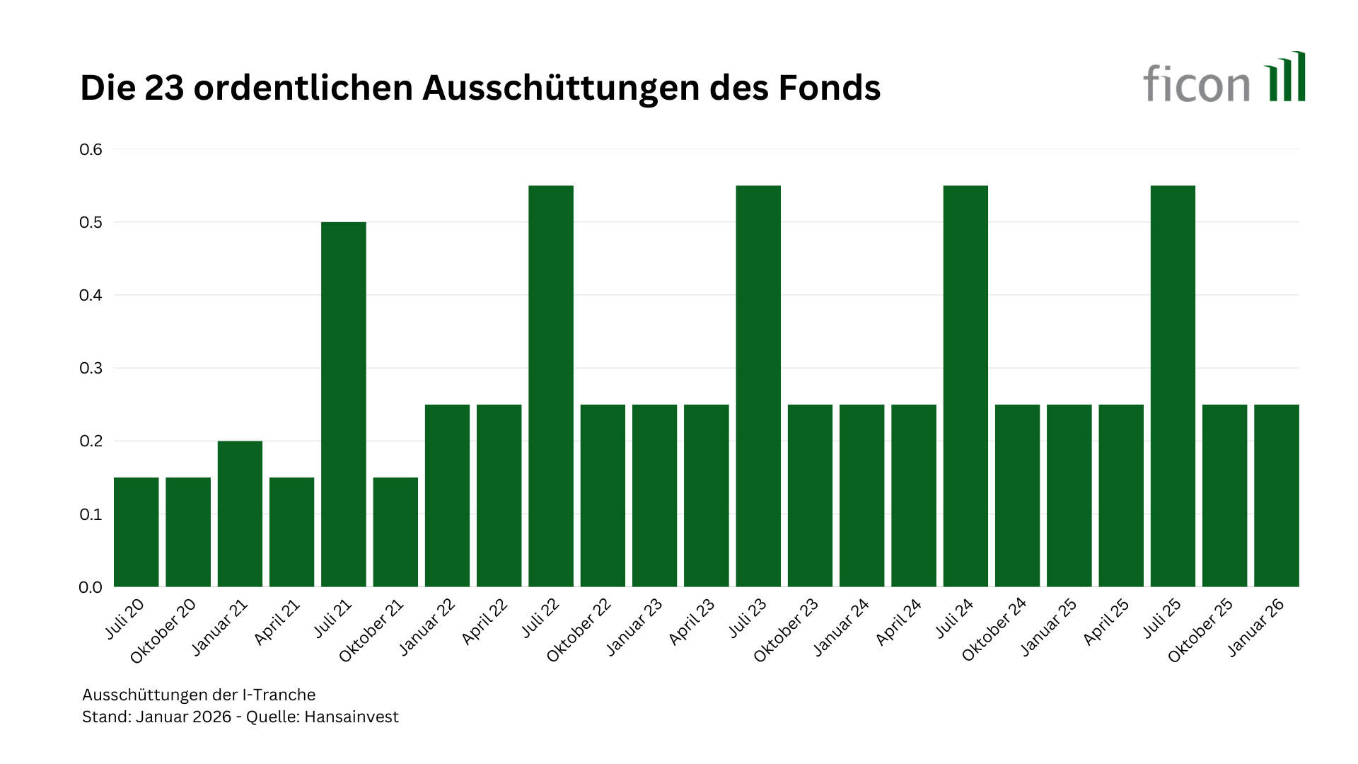 Seit Auflage wurden 23 ordentliche Ausschüttungen geleistet – siehe Ausschüttungsgrafik. Alle Ausschüttungen stammen aus erwirtschafteten Erträgen und erfolgen ohne Substanzverzehr, was eine gut planbare Mittelverwendung ermöglicht.