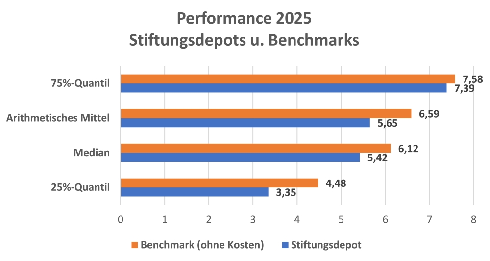 Die Performance der Stiftungsdepots im Jahr 2025 blieb ein wenig hinter dem Ergebnis im Vorjahr zurück. Der Performance-Mittelwert für die 523 erfassten Portfolios lag bei 5,65 (2024: 7,38) Prozent. Der Median-Wert der Performance bzw. das 50%-Quantil war bei 5,42 (6,82) Prozent. Das 25%-Quantil (25 % der Depots sind schlechter) erzielte 3,35 (5,14) Prozent. Das 75%-Quantil kam auf 7,39 (9,12) Prozent. Für jedes dieser Quantile wurde auch eine (Markt-)Benchmark definiert und deren Rendite berechnet (siehe Schaubild); darin sind aber keine Kosten enthalten.