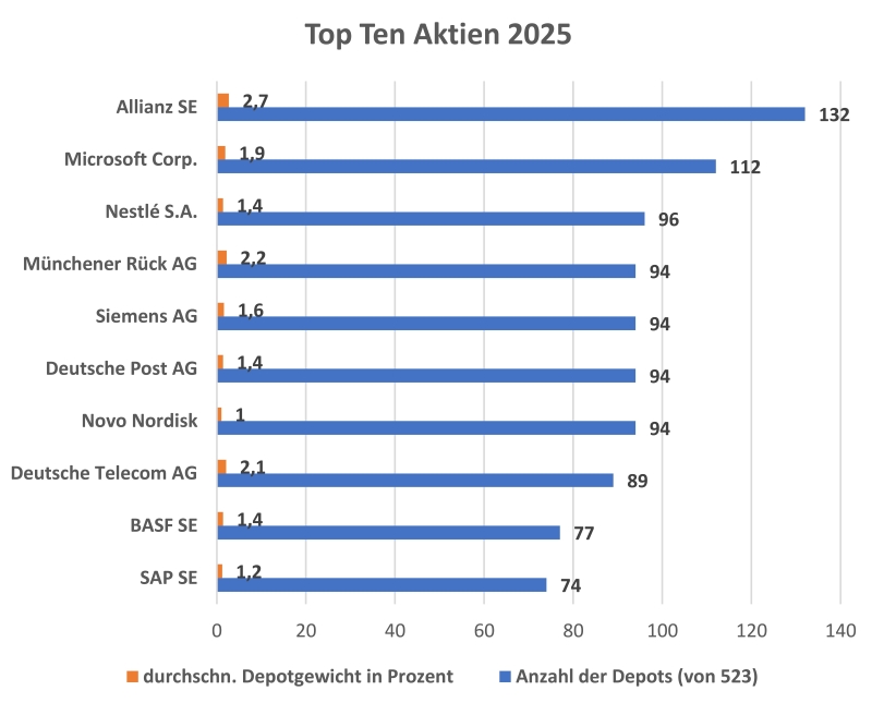 Unter den ersten 10 Aktien sind 7 (2024: 6) DAX-Mitglieder. Auf Position 1 steht, wie in den Vorjahren, die Allianz-Aktie, die in 132 Depots lag, gefolgt von der Microsoft-Aktie, die in 112 Depots anzutreffen war.