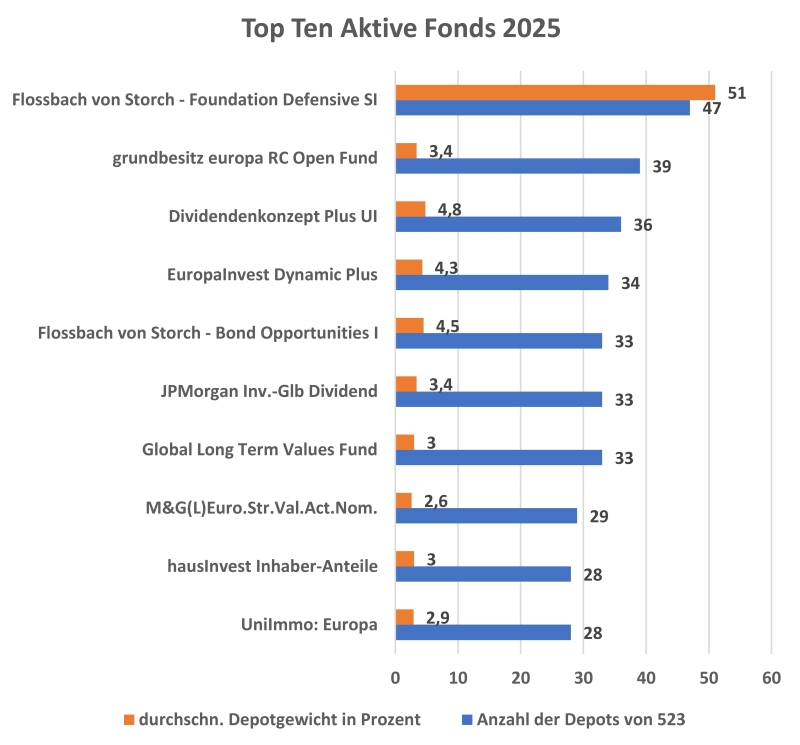 Insgesamt hatten 2025 aktive Investmentfonds ein durchschnittliches Depotgewicht von 43,1 (2024: 43,2) Prozent, wobei Stiftungsfonds ihren Anteil erhöhen konnten und daher mit 13,9 (12,9) Prozent vorne lagen, gefolgt von Mischfonds mit 13,4 (13,6) Prozent, Rentenfonds mit 7,4 (7,6) Prozent und Aktienfonds mit 6,3 (6,4) Prozent. Der Gewichts-Anteil von ETFs ist mit 10,2 (9,2) Prozent deutlich geringer, wobei Aktien-ETFs auf 6,4 und Renten-ETFs auf 3,8 Prozent kommen. Die Quote der Aktien-Einzeltitel lag bei 13,5 (13,8) Prozent, die der Anleihen-Einzeltitel bei 21,3 (20,5) Prozent, zusammen sind das 34,8 Prozent und damit geringfügig mehr als im Vorjahr (34,3).